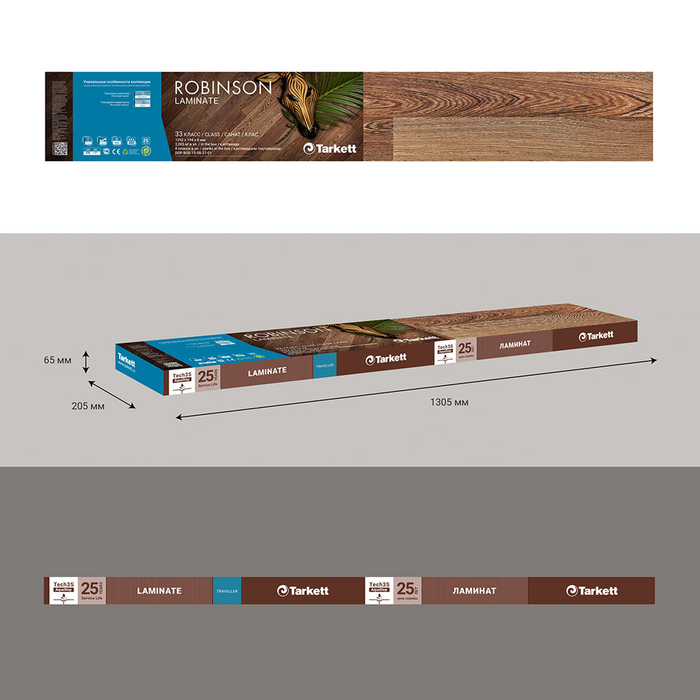 Коллекция ROBINSON 33 класса может укладываться в помещениях даже с высокой интенсивностью использования.rnДизайны этой коллекции отличаются экзотическими мотивами и глянцевой поверхностью.rnДля влагостойкости в ламинате Tarkett применяется технология Tech3S – это обработка специальным воском замкового соединения. А вместе с замком TC-Lock – это легкая укладка.