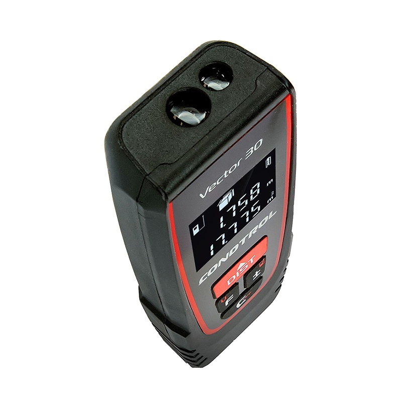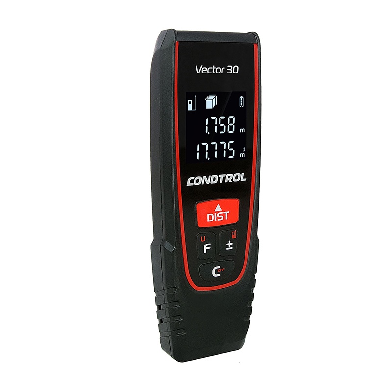 Измеряет расстояние как в помещении, так и на улице на расстоянии до 30 метров с погрешностью не более +/-3 мм. Рассчитан для работы в помещении при любых условиях освещения. Прибор выполняет автоматические вычисления площади, объёма помещения, позволяет складывать и вычитать полученные значения. Функция косвенных вычислений по теореме Пифагора позволит выполнять замеры в труднодоступных местах. Обладает простым и понятным интерфейсом. На корпусе располагаются четыре кнопки управления, каждая из которых отвечает за указанную функцию. Двухстрочный дисплей с подсветкой позволяет работать в условиях низкой освещенности. Герметичный корпус обеспечивает изоляцию от мелкой пыли и капель воды. Благодаря компактным размерам дальномер легко помещается в карман, в поясной чехол или сумку.