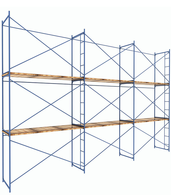 рама с лестницей – 6 шт, рама проходная – 6 шт, диагональные стяжки (длина 3 м) – 9 шт, горизонтальная связь (длина 3 м) – 9 шт, пята опорная – 8 шт, опорная балка (длина 3 м) – 12 шт, щит деревянный (1,1 х 0,95 м) – 18 шт, кронштейн – 8 шт, анкерный болт – 8 шт.