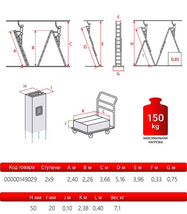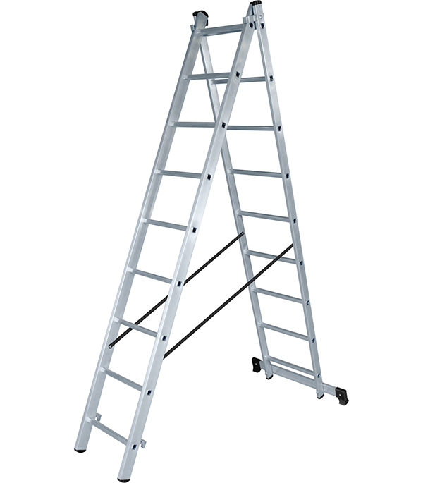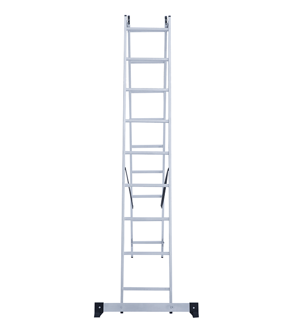 Предназначена для выполнения строительных, ремонтных, отделочных или иных видов работ, когда необходимо произвести какие-либо действия на высоте. rnЛестница многофункциональная алюминиевая 2-х секционная, в каждой секции 9 ступеней. Имеет широкие алюминиевые скобы, обеспечивающие плотный зажим выносной секции и прочные страховочные стяжки, предохраняющие лестницу от самопроизвольного раскладывания.rnРабочая высота – это параметр, рассчитываемый путем сложения высоты верхней секции лестницы/стремянки и роста человека с вытянутой вверх рукой (в среднем, два метра).