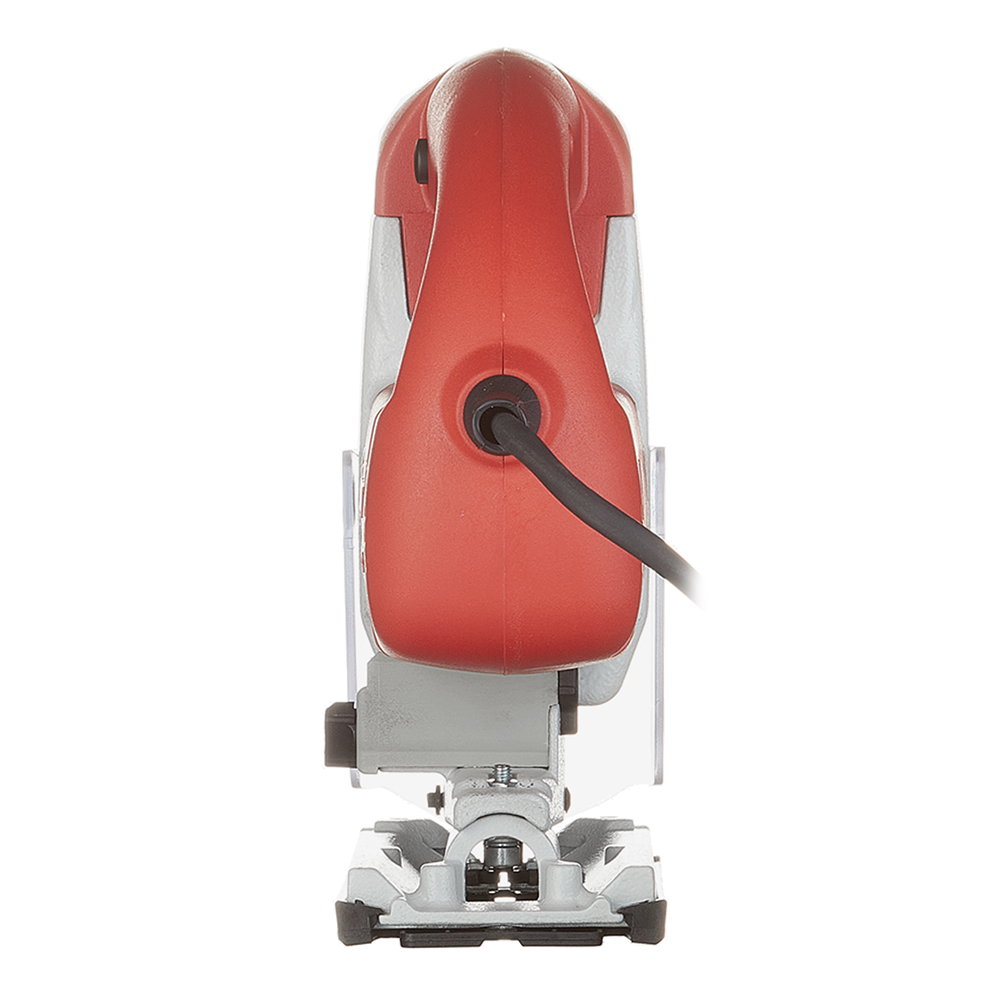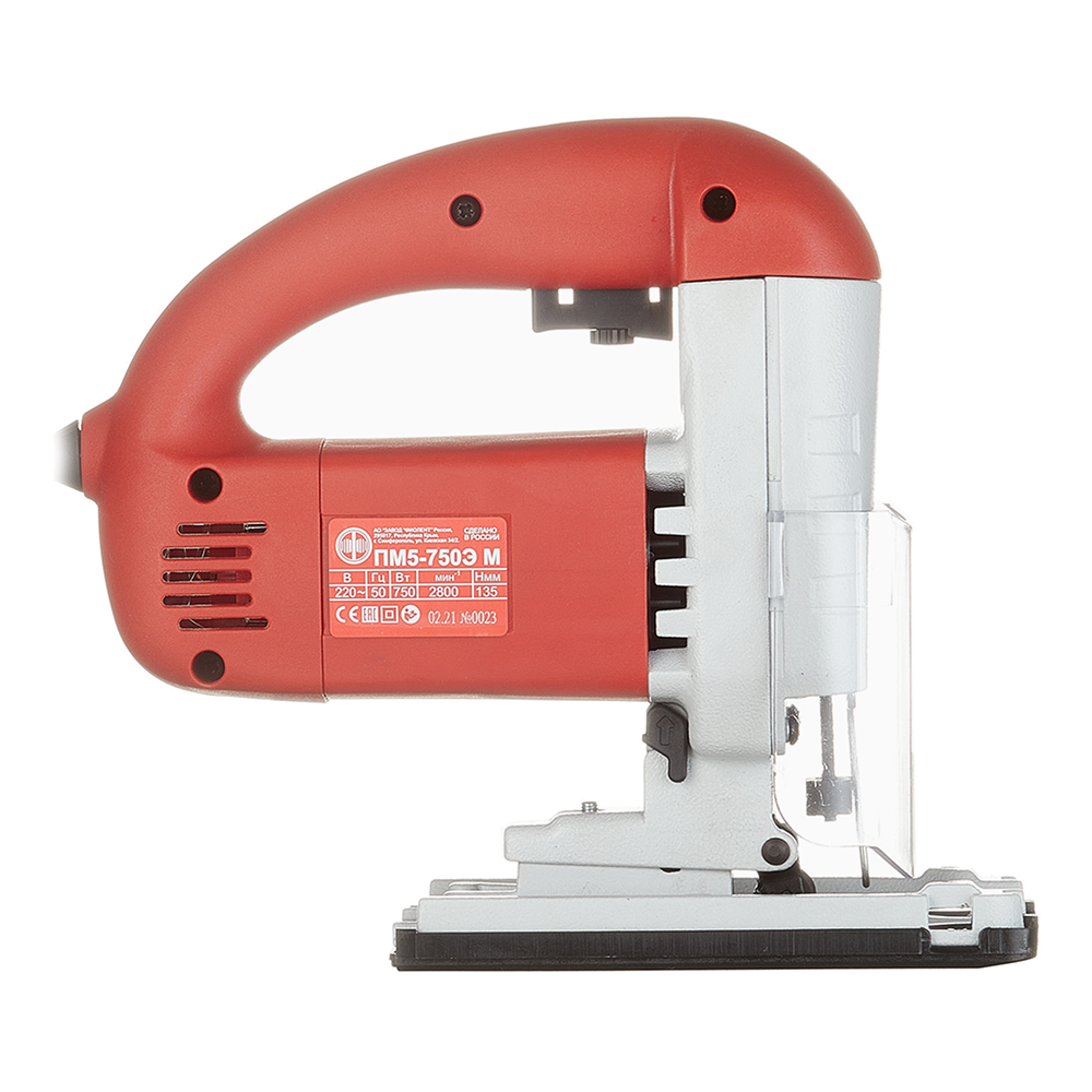 Электрический лобзик ПМ5-750Э М служит для обработки древесины, ДСП, ДВП, пластмасс и металла. С помощью него осуществляется прямолинейное и криволинейное пиление, а также пиление перпендикулярно и под углом к поверхности. Инструмент надежен в эксплуатации и имеет высокий рабочий ресурс, так как оснащен улучшенным электроприводом и высококачественными комплектующими. Корпуса редуктора из алюминиевого сплава обеспечивают долговечность изделия и отвод тепла. Подключение пылесоса при помощи патрубка (поставляется в комплекте). Выпиливание отверстий диаметром от 80 до 460 мм и пиление параллельно кромке производится с помощью линейки (поставляется в комплекте).rnДля выполнения работ по гладким поверхностям применяется антифрикционная накладка (поставляется в комплекте).rnЗащитная скоба, установленная перед пилкой и прозрачный дополнительный кожух обеспечивают безопасность в работе (поставляется в комплекте). При пилении перпендикулярно к поверхности пилка поддерживается боковыми вкладышами, расположенными на основании, что повышает точность реза и не требует дополнительной обработки кромок. Направляющий ролик на рычаге маятникового движения обеспечивает устойчивое положение пилки на всех режимах.rnВысокая производительность пиления обеспечивается регулируемым пятиступенчатым маятниковым движением пилки. Пиление материала перпендикулярно или под углом к поверхности от -30° до 45°. Фиксация выключателя в нажатом положении обеспечивает удобную работу в непрерывном режиме. Регулирование частоты ходов пилки позволяет подобрать оптимальные режимы обработки разных материалов. Сдув опилок из зоны пиления обеспечивает обзор для точного ведения по намеченной линии.