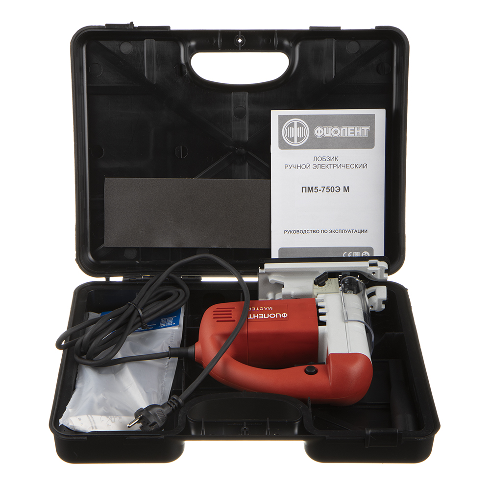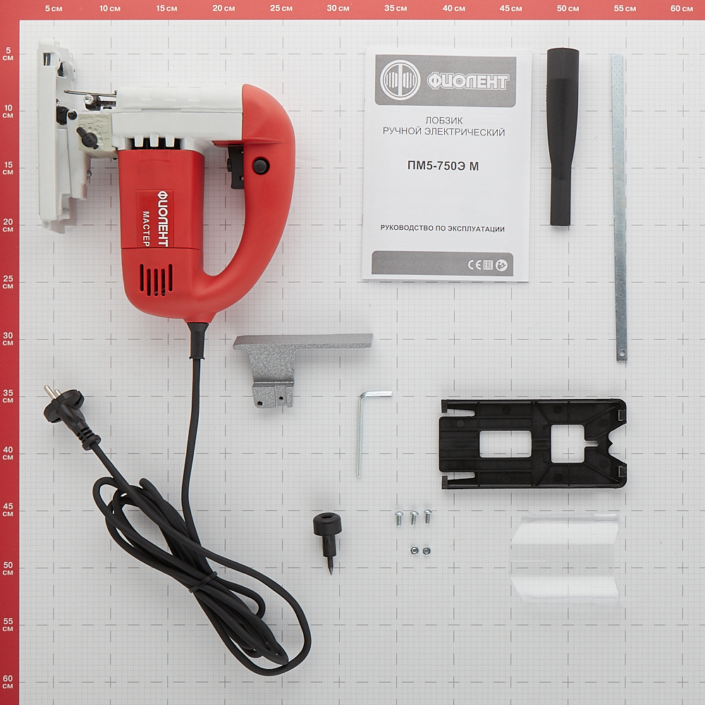 Электрический лобзик ПМ5-750Э М – 1 шт, линейка – 1 шт, патрубок – 1 шт, накладка к основанию лобзика – 1 шт, защитный кожух – 1 шт, ключ шестигранный 4,0х70 – 1 шт, руководство по эксплуатации – 1 шт.