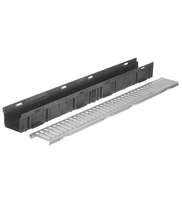 Лоток водоотводный, 1000х115х95мм., пластиковый со стальной решеткой. Класс А15 – для пешеходных зон.rnКомплект лотка со стальной оцинкованной решеткой – это готовое к установке решение, имеет возможность соединения их между собой в линию требуемой протяженности.rnВыпуск собранных вод из линии лотков лучше осуществить в канализацию через пескоуловитель (арт. 139623), который предварительно очистит стоки от частичек грязи и песка.rnТак же выпуск собранной воды может осуществляться путем подключения канализационной трубы Ф70 мм напрямую к лотку, к специально предусмотренным фланцам в дне лотка.rnС помощью переходника на Ф110 мм, возможно подключение канализационной трубы Ф110 мм. rnПри необходимости возможно осуществить угловое и Т-образное соединение данных лотков с помощью специальных фланцев для углового соединения расположенных в четырех местах на боковых поверхностях лотка.
