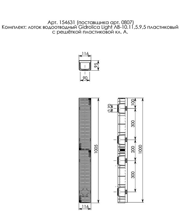 Лоток водоотводный 1000х115х95 мм, пластиковый с пластиковыми решетками.rnПредназначен для поверхностного водоотвода ливневых и талых вод от фундамента домов и строений, а так же с дорожек, в зонах с пешеходным движением. rnКомплект лотка с двумя пластиковыми решетками по 500 мм – это готовое к установке решение.rnЛоток поставляется с уже установленными решетками, без необходимости в дополнительном крепеже.rnИмеется возможность соединения лотков между собой в линию требуемой протяженности. Выпуск собранных вод из линии лотков лучше осуществить в канализацию через пескоуловитель (арт. 139623), который предварительно очистит стоки от частичек грязи и песка.rnТак же выпуск собранной воды может осуществляться путем подключения канализационной трубы d70 мм напрямую к лотку, к специально предусмотренным фланцам в дне лотка.rnС помощью переходника на d110 мм, возможно подключение канализационной трубы d110 мм. rnПри необходимости возможно осуществить угловое и Т-образное соединение данных лотков с помощью специальных фланцев для углового соединения расположенных в четырех местах на боковых поверхностях лотка. rnКласс нагрузки А15 – для пешеходных зон.