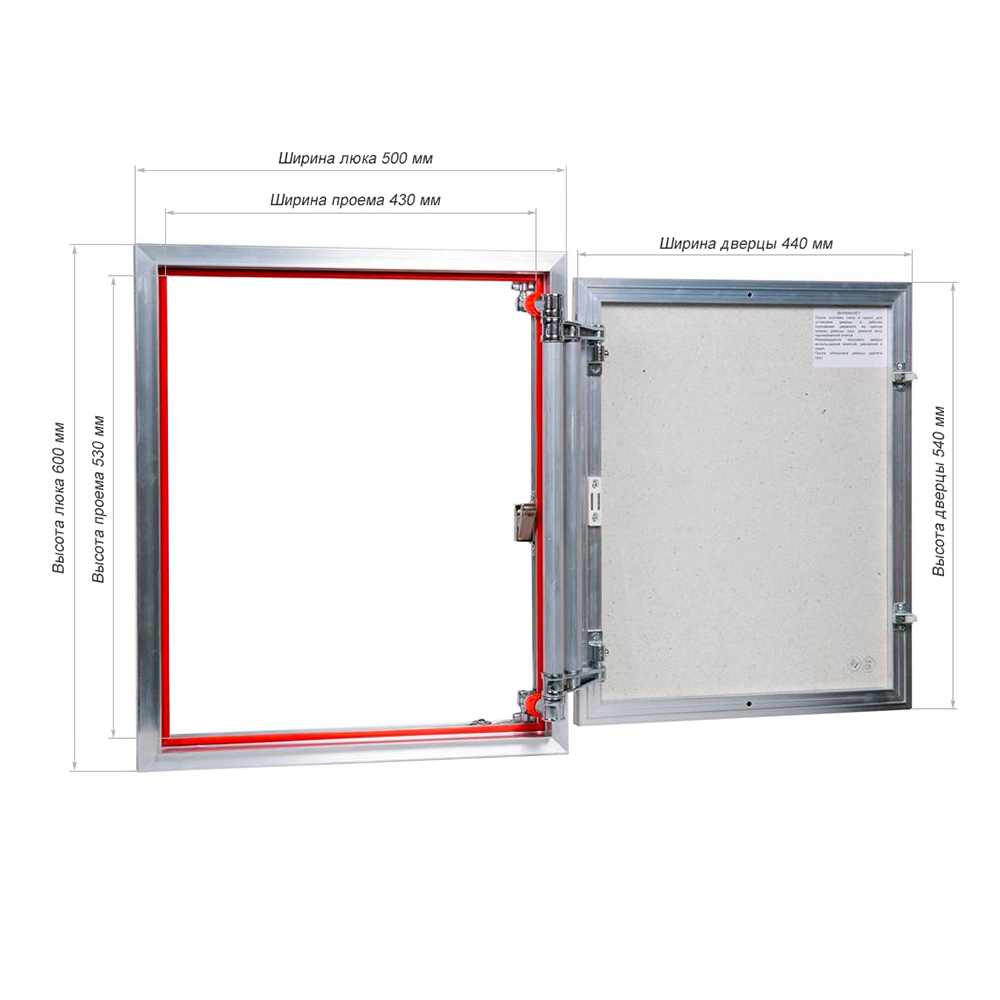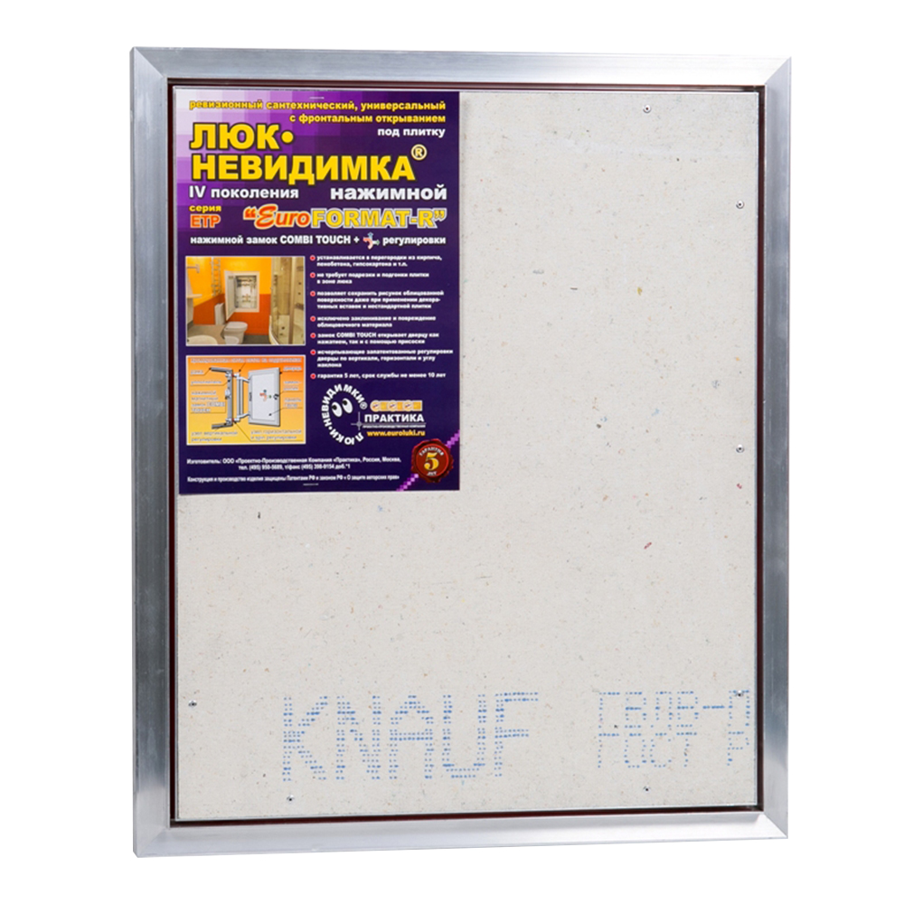Люк-невидимка® ЕвроФОРМАТ-Р ЕТР 500х600rnНажимной люк ЕТР 50-60, усиленной конструкции, с шириной 500 мм и высотой 600 мм, предназначен для доступа к счётчикам, к шаровым кранам водоснабжения, к сливным трубам под ванной.rnГлубина люка в 55 мм и отсутствие выступающих элементов петли помогают экономить каждый миллиметр свободного пространства.rnРаспашная дверца люка 440х540 мм открывается до 180° и может быть облицована керамической плиткой и другими отделочными материалами, общим весом до 18 кг. Чтобы открыть дверцу, используется мощный магнитно-нажимной замок CombiTOUCH®.rnПо периметру проема люка с размерами 430х530 мм установлен лепестковый силиконовый уплотнитель, который надежно защищает от пыли и влаги и обеспечивает звукоизоляцию.