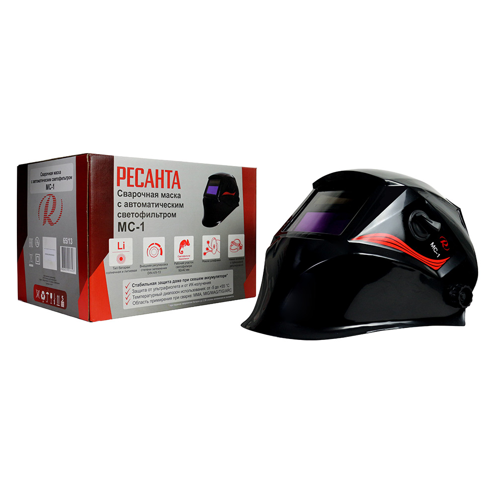 Сварочная маска РЕСАНТА МС-1 предназначена для защиты глаз от видимого, ультрафиолетового и инфракрасного излучения, а также для защиты головы и шеи от попадания искр при сварочных работах. Маска данного типа удобна, поскольку светофильтр автоматически затемняется при зажигании дуги. Такой светофильтр назвали «хамелеоном» из-за способности автоматически затемняться. Степень затемнения можно настраивать с помощью встроенного регулятора в зависимости от модели маски.rnСветофильтр сварочных масок РЕСАНТА имеет структуру слоеного пирога. Первым слоем идет защитный экран, предназначенный для защиты внутренних слоев от механических повреждений. Затем идут несколько слоев жидких кристаллов, чередуясь с поляризационными пленками, для защиты глаз от яркого видимого излучения. И, наконец, последним слоем идет ультрафиолетовый и инфракрасный фильтр, который практически полностью поглощает ультрафиолетовое и инфракрасное излучение.