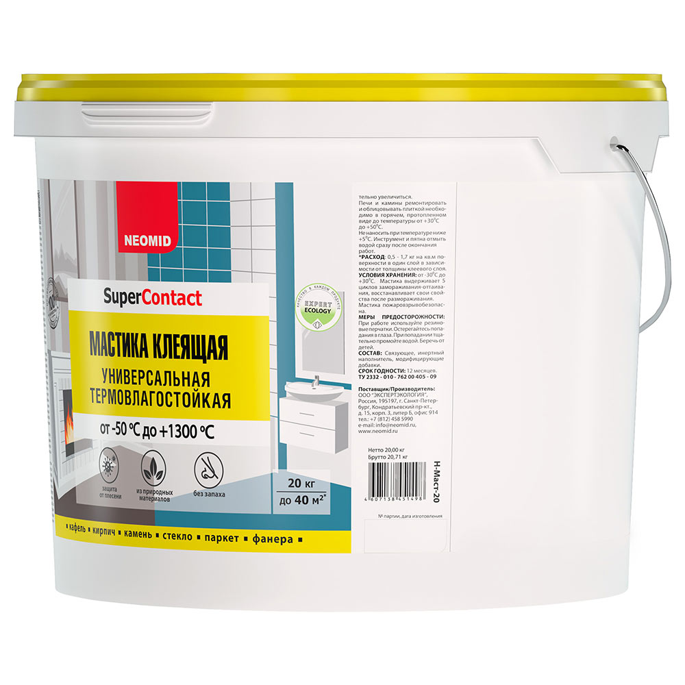 Мастика клеящая универсальная термовлагостойкая (высохший клеевой шов выдерживает температуру от -50°С до +1300°С) «NEOMID» предназначена для кладки и облицовки печей и каминов, склеивания кафельной и метлахской плитки, стекла, пенополистирольных потолочных плиток, дерева, картона, бетона, кирпича, натурального и искусственного камня (кроме материалов на гипсовой основе) в любых сочетаниях, неглубокой шпатлевки оштукатуренных и бетонных поверхностей, наклеивания фанеры на стяжку (кроме поверхностей, имеющих постоянный контакт с водой). При склеивании материалов имеющих периодический контакт с водой, для швов использовать влагоустойчивые герметики или затирки. Содержит антисептические добавки. Препятствует образованию плесени и грибов.