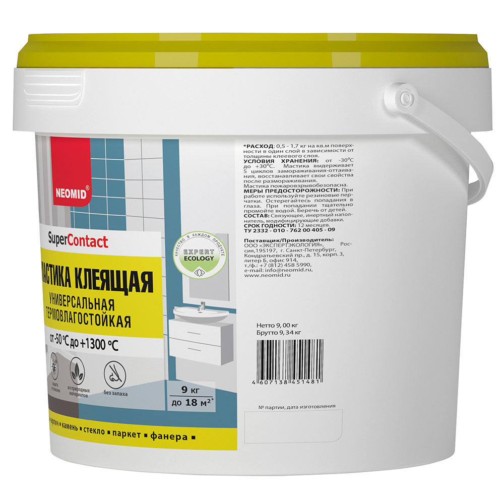 Мастика клеящая универсальная термовлагостойкая (высохший клеевой шов выдерживает температуру от -50°С до +1300°С) «NEOMID» предназначена для кладки и облицовки печей и каминов, склеивания кафельной и метлахской плитки, стекла, пенополистирольных потолочных плиток, дерева, картона, бетона, кирпича, натурального и искусственного камня (кроме материалов на гипсовой основе) в любых сочетаниях, неглубокой шпатлевки оштукатуренных и бетонных поверхностей, наклеивания фанеры на стяжку (кроме поверхностей, имеющих постоянный контакт с водой). При склеивании материалов имеющих периодический контакт с водой, для швов использовать влагоустойчивые герметики или затирки. Содержит антисептические добавки. Препятствует образованию плесени и грибов.