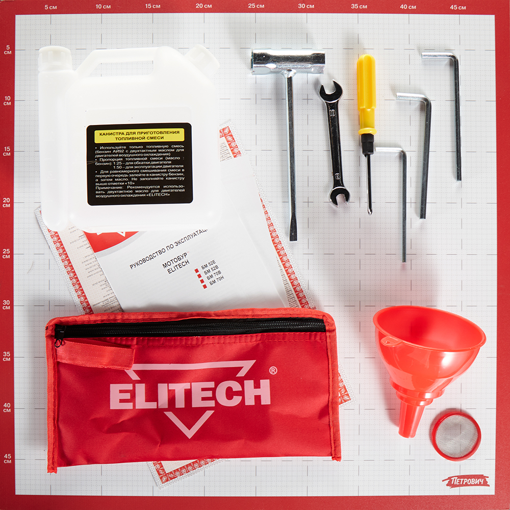 мотобур, канистра для приготовления топливной смеси, набор инструментов, воронка, руководство по эксплуатации, коробка.