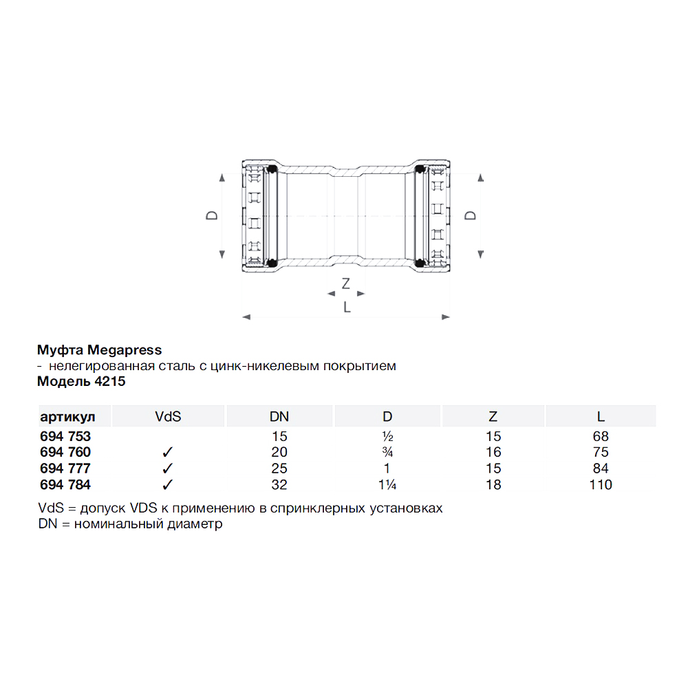 Муфта Viega Megapress SC-Contur (694760) 3/4DN20 пресс нелегированная оцинкованная сталь