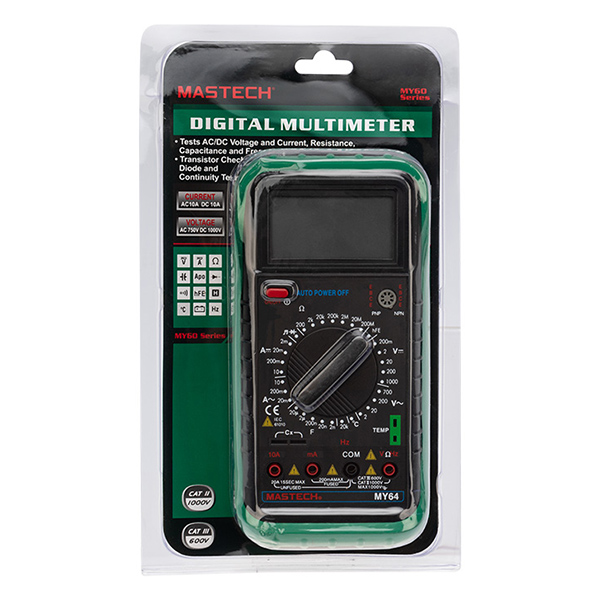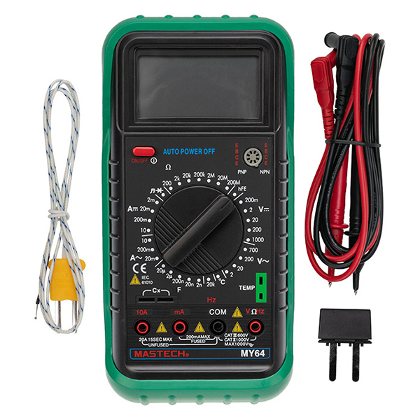 Предназначен для измерения постоянного и переменного напряжения, постоянного тока, сопротивления в цепи, температуры, частоты и проверки транзисторов. А также, с помощью прибора MY64 можно проводить тестирование диодов, прозвонку целостности цепи и измерение коэффициента усиления транзисторов.rnПрибор имеет функцию удержания результата измерений DATA HOLD для тех случаев, когда измерения проводятся в труднодоступных местах и не всегда есть возможность взглянуть на экран.rnПрибор MY64 является полноразмерным универсальным мультиметром классического форм-фактора с широким функционалом, с большим ручным выбором диапазонов измерений , который можно использовать практически в любой сфере деятельности.rnИнженеры старались сделать прибор максимально удобным для использования. Выбор измеряемых величин и пределов измерений производится с помощью усиленного поворотного регулятора, благодаря которому исключается возможность случайного нажатия. Прибор изготовлен из высококачественных материалов.rnКалибровка и тестирование приборов произведено под контролем компании REXANT INTERNATIONAL.