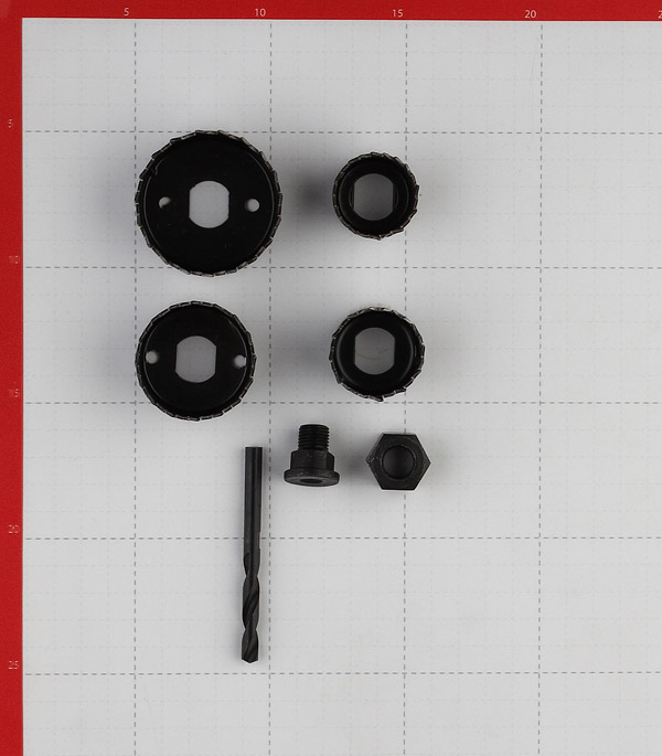 4 коронки разного диаметра, адаптер, ключ.