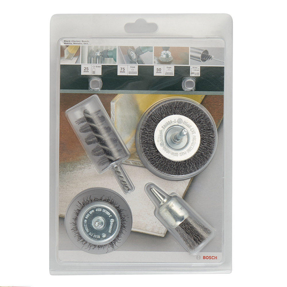 Набор проволочных щеток Bosch 2609256553. Предназначен для обработки металлических и не металических конструкций, тонколистового металла, снятия ржавчины, мелких заусенцев, лака, краски, окалины, обработки сварных швов с помощью дрели снятия краски, ржавчины.