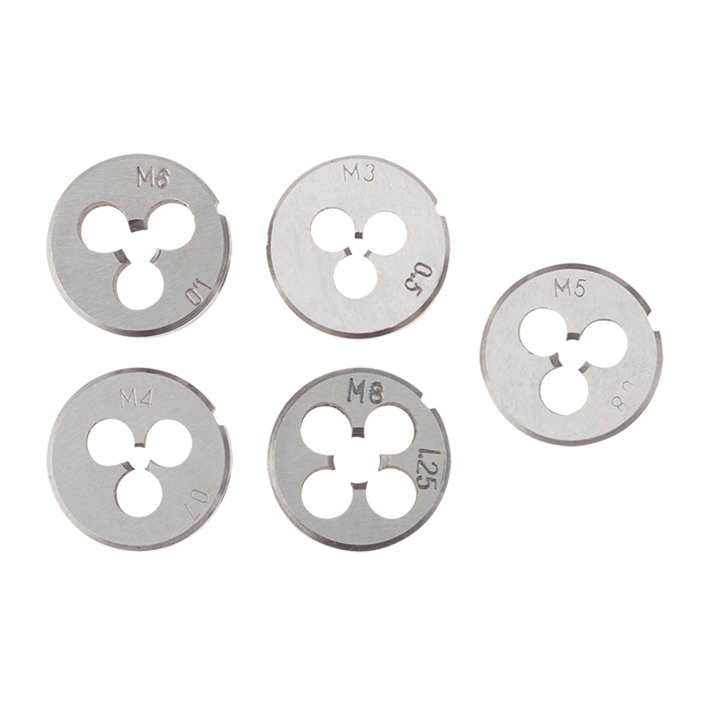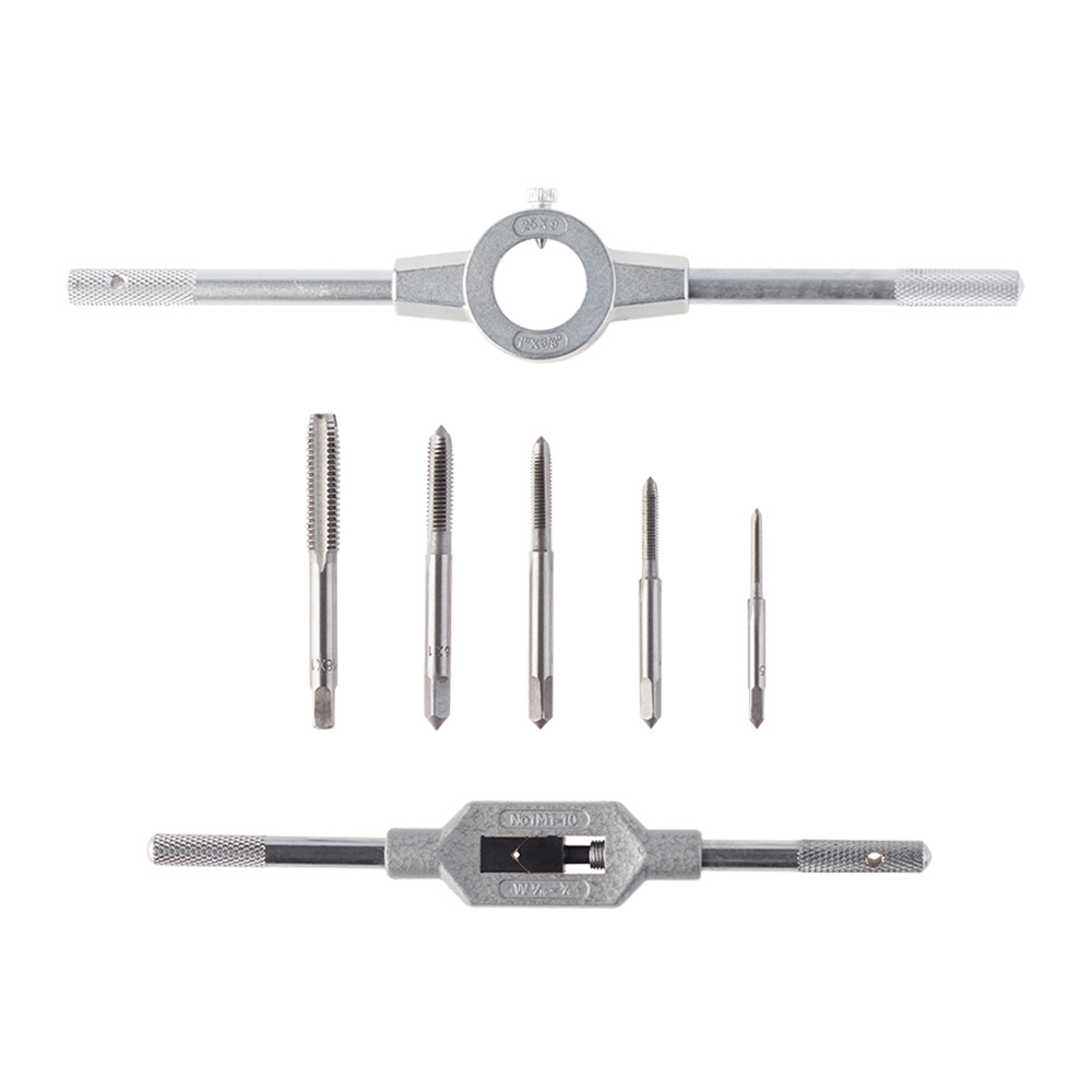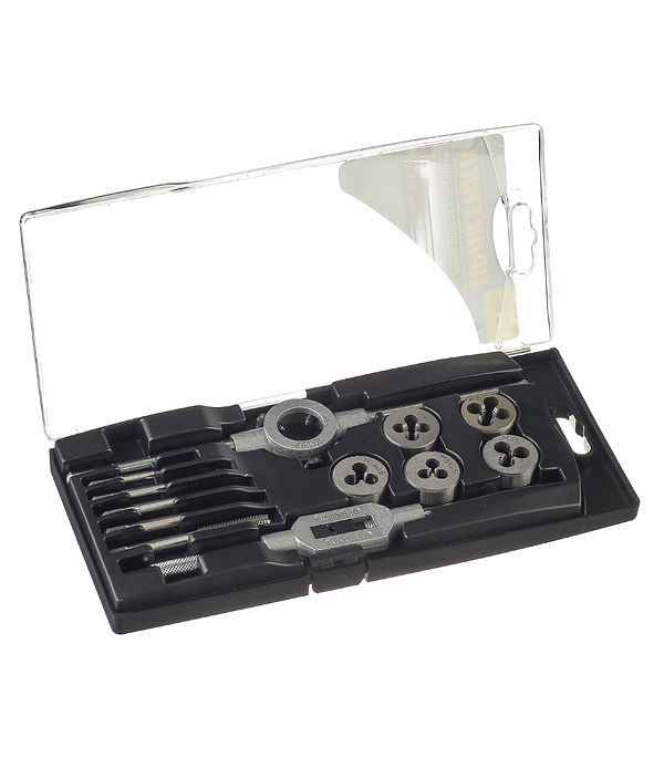 плашки и метчики: М3,0х0,5 мм, М4,0х0,7 мм, М5,0х0,8 мм, М6,0х1,0 мм, М8,0х1,25 мм, плашкодержатель, метчикодержатель.