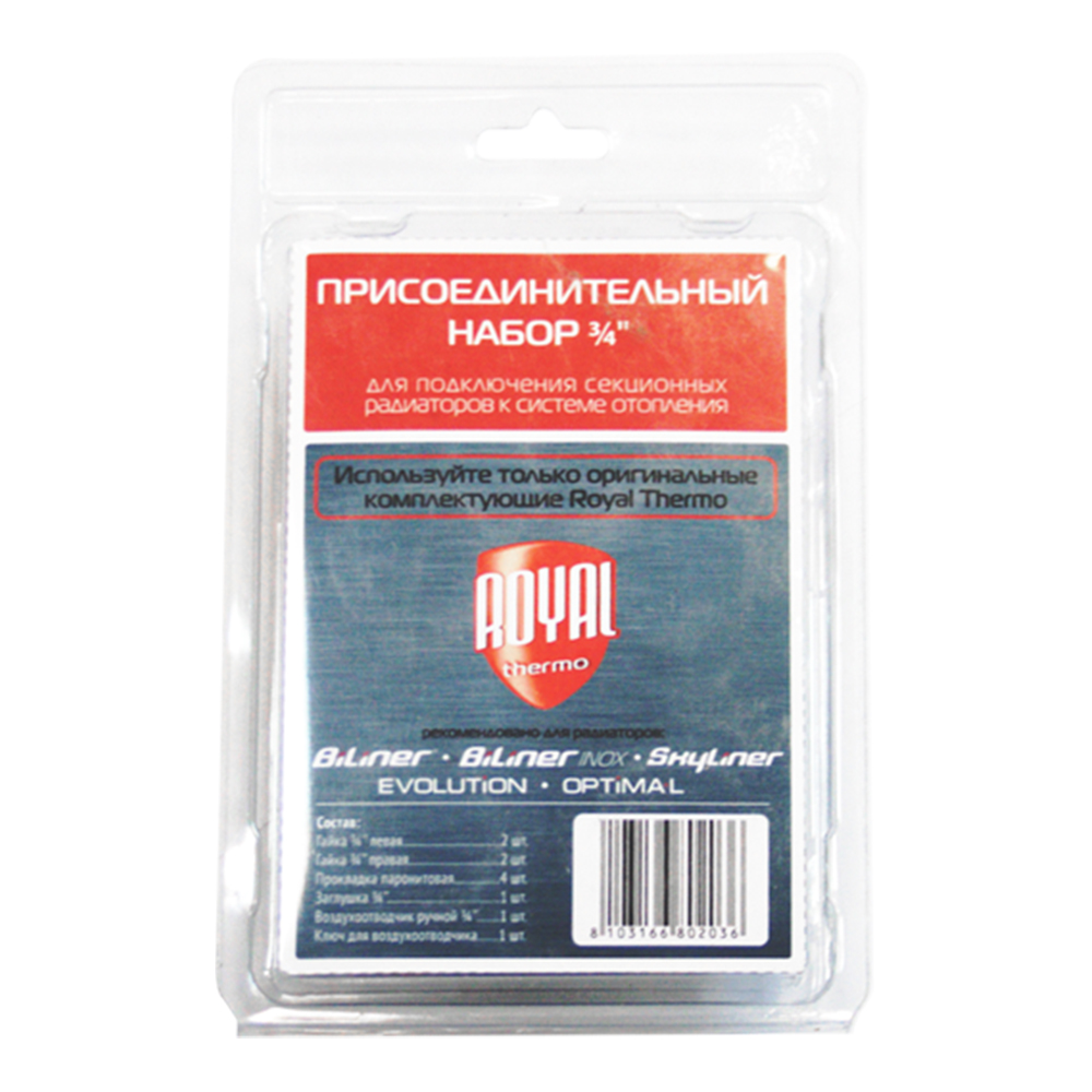 Присоединительный набор Royal Thermo 3/4white предназначен для монтажа секционных радиаторов белого цвета.rnНабор с присоединительным размером 3/4подходит как к биметаллическим дизайн-радиатором итальянского производства: PIANOFORTE, PIANOFORTE TOWER и BILINER, так и к моделям биметаллических и алюминиевых радиаторов Royal Thermo из российской линейки.