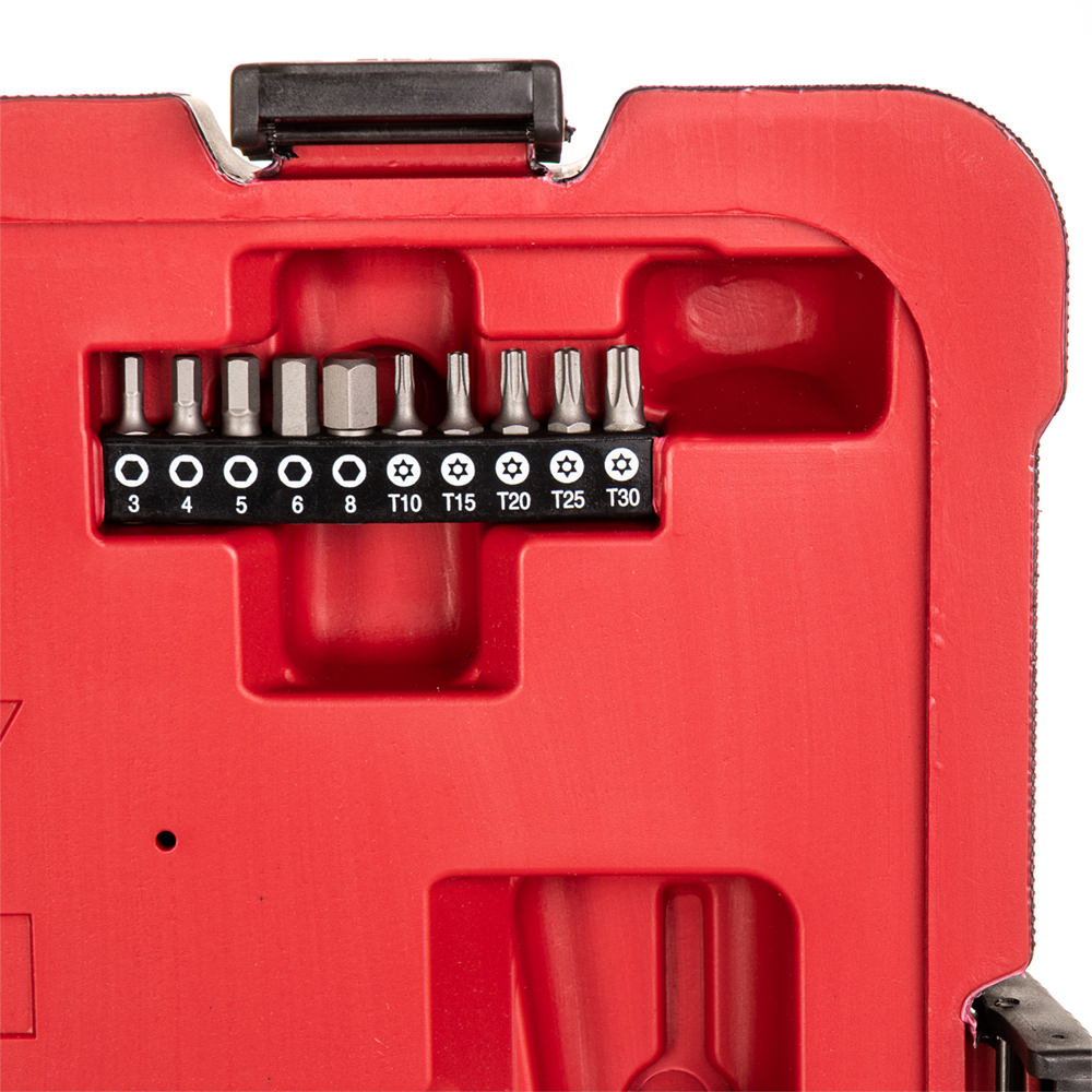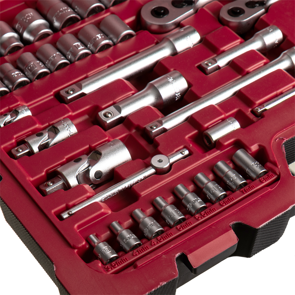 Набор предназначен для откручивания и закручивания гаек и болтов различного диаметра. В комплекте 96 предметов. Прочная конструкция из хромованадиевой стали, соответствие стандартам ISO 3318 и DIN 3113 по точности и производительности.rn – 11 торцевых 6-гранных головок 1/2” – 14, 15, 16, 17, 18, 19, 20, 21, 22, 23, 24 мм;rn – 12 торцевых 6-гранных головок 3/8” – 8, 9, 10, 11, 12, 13, 14, 15, 16, 17, 18, 19 мм;rn – 14 торцевых 6-гранных головок 1/4” – 3,5, 4, 4.5, 5, 5.5, 6, 7, 8, 9, 10, 11, 12, 13, 14 мм;rn – 3 карданных шарнира – 1/2”, 3/8”, 1/4”;rn – 2 удлинителя 1/2” – 125, 75 мм;rn – 2 удлинителя 3/8” – 150,75 мм;rn – 2 удлинителя 1/4” – 150, 75 мм; rn – 1 Т-образная скользящая рукоятка 1/4”; rn – набор из 6-ти ключей 6-гранных коротких – 1.5, 2, 2.5, 3, 4, 4.5 мм;rn- набор из 8-ми ключей 6-гранных длинных – 1.5, 2, 2.5, 3, 4, 5, 6, 7 мм; rn – 1 рукоятка для отверточных вставок 1/4”; rn – 1 адаптер для вставок 1/4” – 20 вставок 1/4” – SL4,6,8 мм; rn – PH0, PH1, PH2, PH3; PZ1, PZ2, PZ3; rn – SQ3, SQ4, SQ5, SQ6, SQ8; rn – TT10, TT15, TT20, TT25, TT30