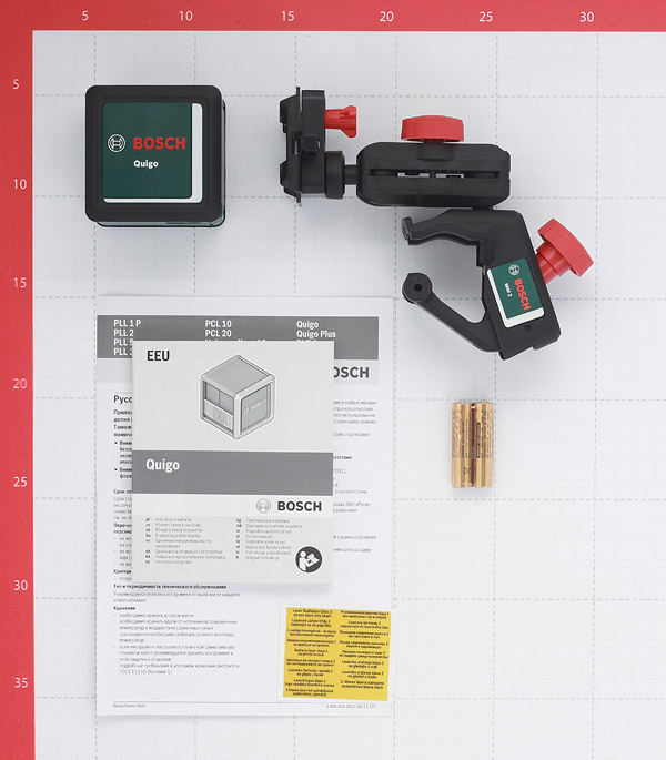нивелир, чехол, две батарейки ААА, скоба для крепления.