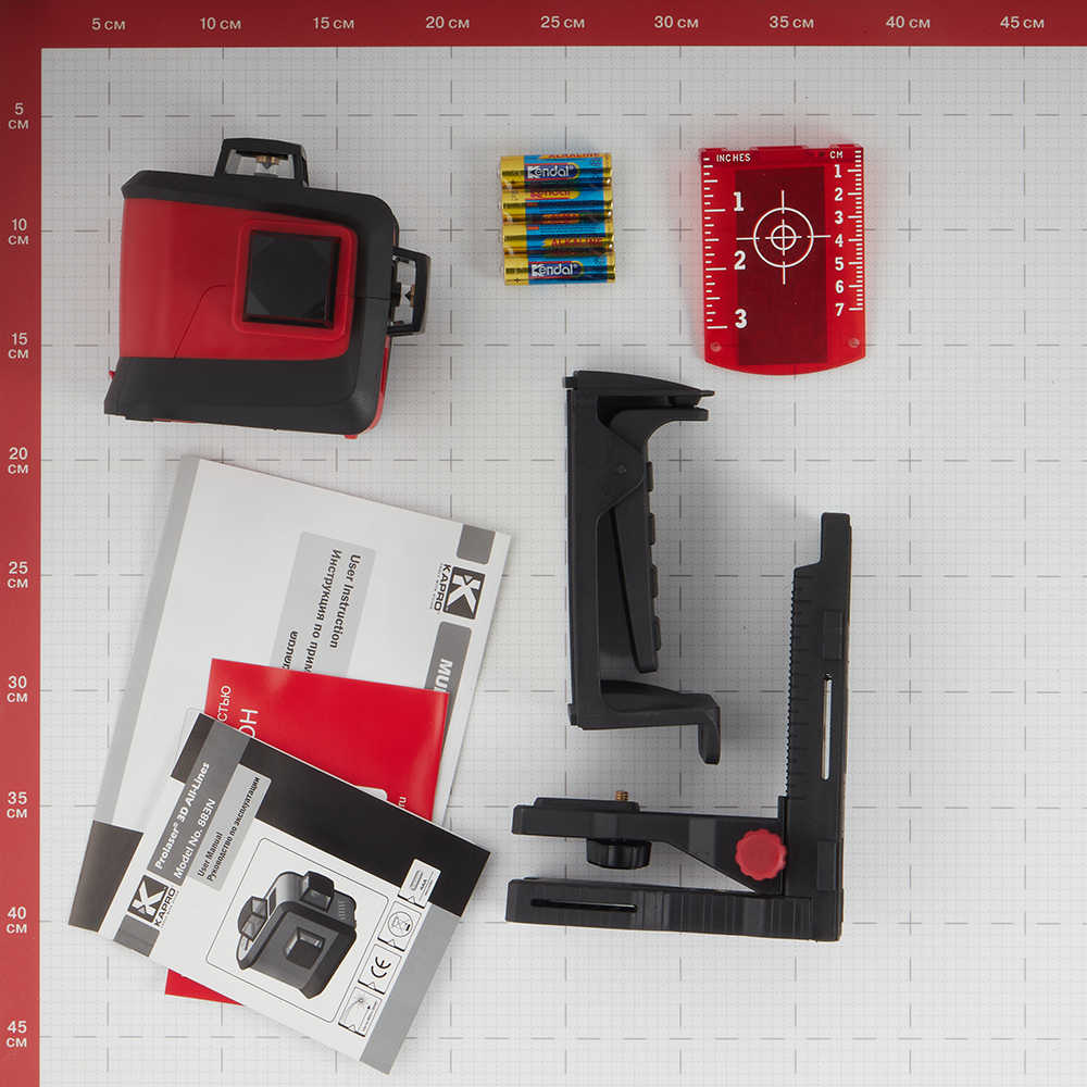 лазерный нивелир, жесткий футляр, настенный кронштейн с раздвижным вертикальным наклонным механизмом, мишень.