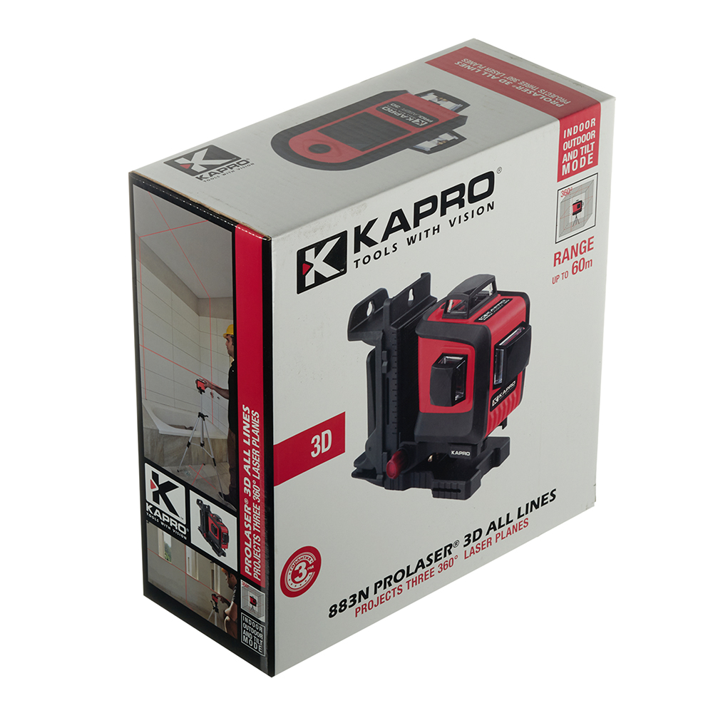 Нивелир лазерный (уровень) Kapro 3D 883N предназначен для производства любительских и профессиональных строительных и ремонтных работ, установка подвесных шкафов и полок, облицовка полов и стен плиткой, монтаж гипсокартонных стен, перегородок и подвесных потолков, установка окон и дверей, расположение электрических и сантехнических коммуникаций, а также стоек и опор, точная разметка под прямым углом для напольных покрытий, забров, ворот, настилов, навесов, наклонная разметка для лестинц, балок, крыш (ручной режим) и пр. В устройстве использованы качественные светодиоды и подшипник устройства маятника произведенные в Японии.
