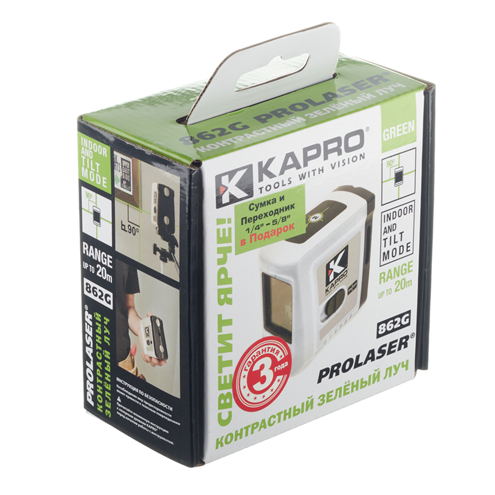 Нивелир лазерный (уровень) Kapro 862G для производства профессиональных и любительских строительных работ, выравнивание плитки, шкафов, бордюров, профилей и окантовок, установка дверей и окон, навешивание полок, картин и пр. В устройстве использованы качественные немецкие светодиоды OSRAM и подшипник устройства маятника произведенный в Японии, магниты из редкоземельных металлов. Зеленые лучи для максимальной видимости. В приборе сделаны: V-образная канавка для крепления на трубах, прорезь на крышке под саморез.