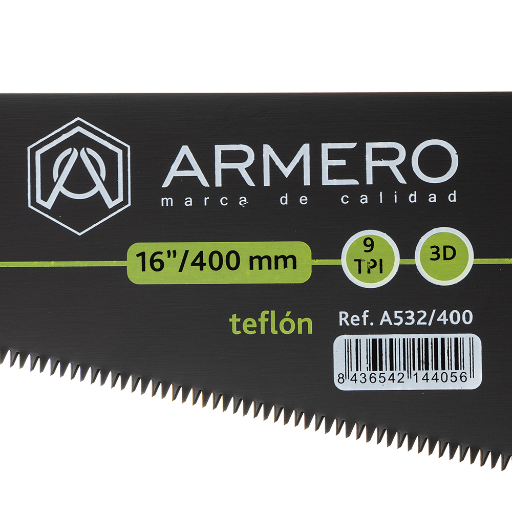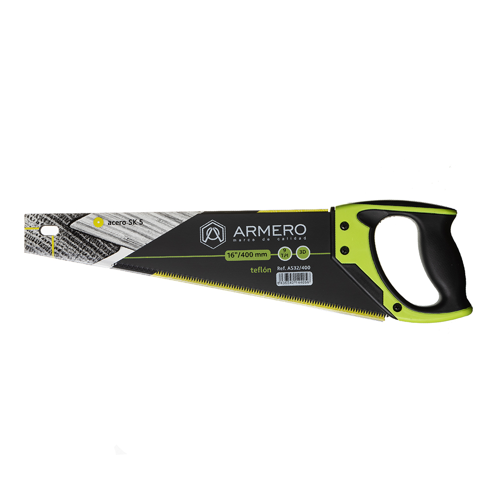 Предназначена для распиловки древесины, фанеры, ДВП, ДСП, ламината и др. Имеет закаленные, заточенные с трех сторон зубья и тефлоновое покрытие, что уменьшает сопротивление материала и облегчает распиливание. Ножовка имеет средний зуб в количестве 9 штук на дюйм.