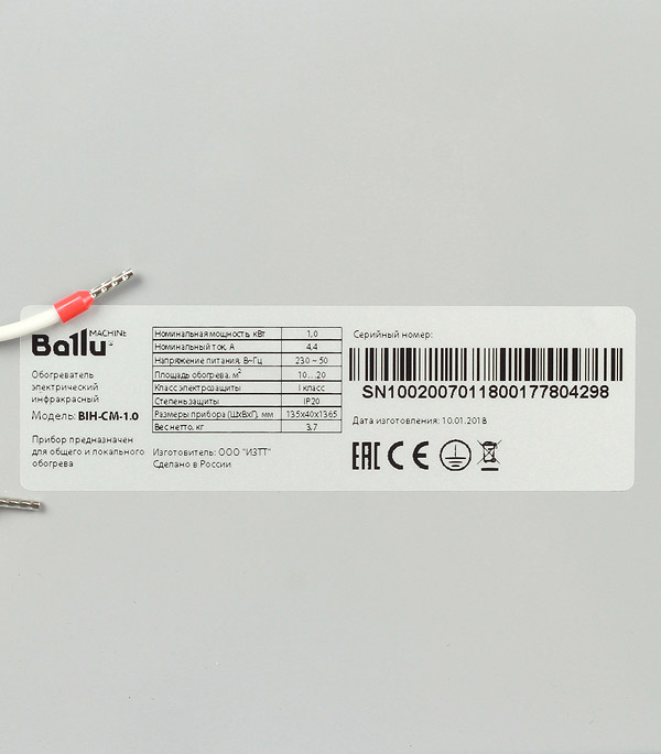 Инфракрасный обогреватель – 1 шт., кронштейн для крепления к прибору – 2 шт., дюбель 6х30 – 2 шт., крючок-полукольцо – 2 шт., руководство по эксплуатации и гарантийный талон – 1 шт., упаковка – 1 шт.