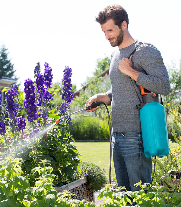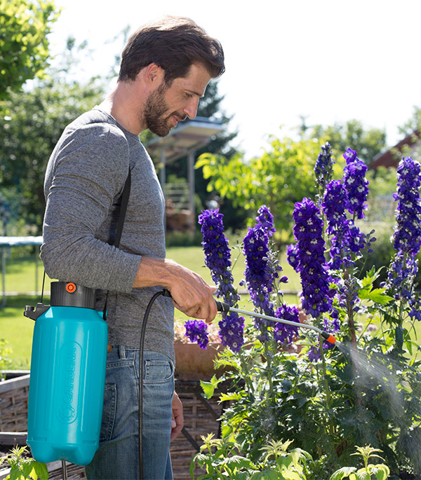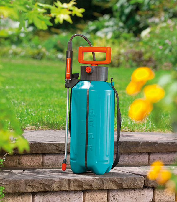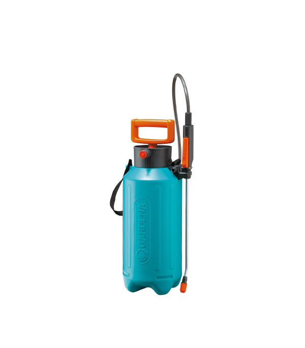 Садовый опрыскиватель GARDENA вмещает 5 л жидкости и идеально подходит для ухода за садовыми растениями. Опрыскиватель рассчитан на давление не более 3 бар и снабжен предохранительным клапаном для быстрого сброса давления в целях обеспечения безопасной эксплуатации. Индикатор уровня показывает количество жидкости в емкости, при этом емкость открывать не требуется. Наличие эргономичной D-образной рукоятки облегчает подачу воду. Расположенный под углом распылитель идеально подходит для полива под листьями. Практичный курок с фиксатором и плечевой ремень гарантируют удобную эксплуатацию опрыскивателя.rnНаличие длинного шланга позволяет легко поливать даже высокие растения, вне зависимости от места расположения опрыскивателя (на земле или на тележке).rnНаличие плечевого ремня позволяет без труда носить напорный опрыскиватель по саду, обеспечивая удобство его эксплуатации.rnИндикатор уровня позволяет определить количество жидкости в емкости – открывать опрыскиватель для этого не требуется.rnБезопасность эксплуатации опрыскивателя обеспечивается с помощью предохранительного клапана, который при необходимости позволяет сбросить давление внутри емкости.