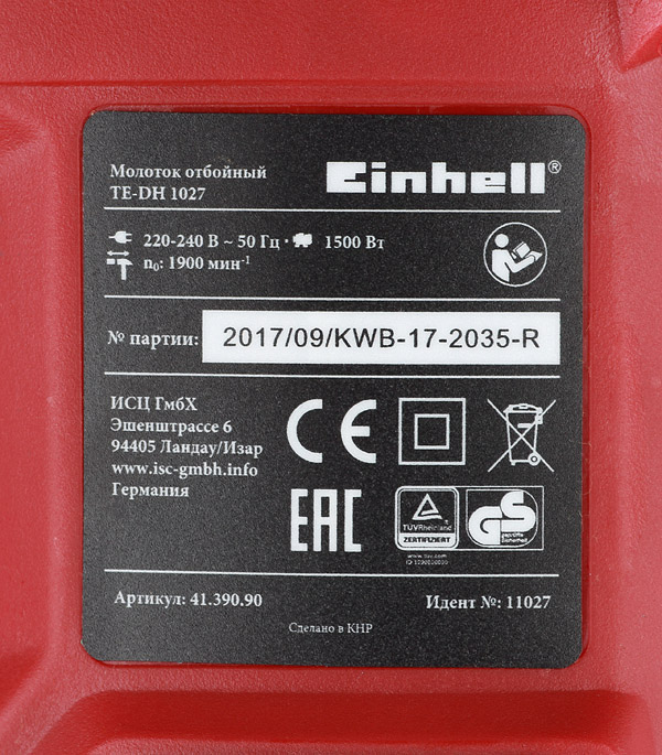 Отбойный молоток, дополнительная рукоятка, 1 пикообразное долото, документация, кейс.