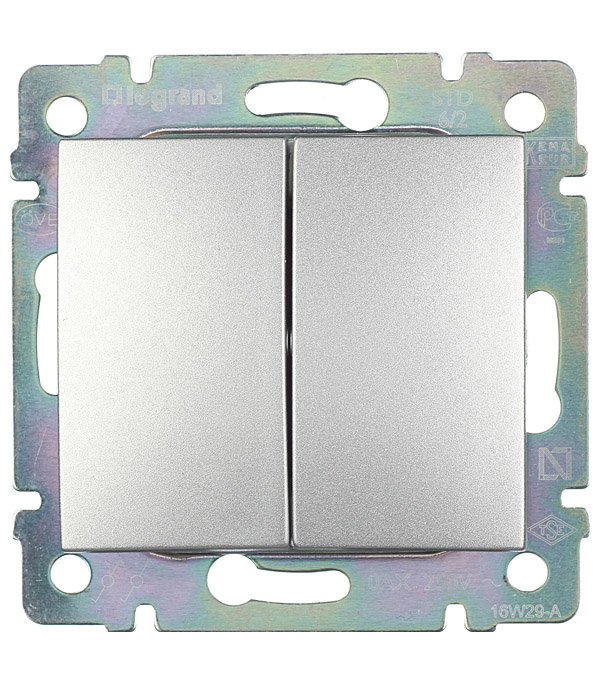 Предназначен для управления светом из разных мест помещения, например в коридорах – один выключатель устанавливается в начале коридора, другой в конце, на лестницах – один выключатель внизу, другой вверху и др. В двухклавишном переключателе каждая клавиша является переключателем. Возможно использовать, как обычный выключатель. Устанавливается вместе с рамкой.