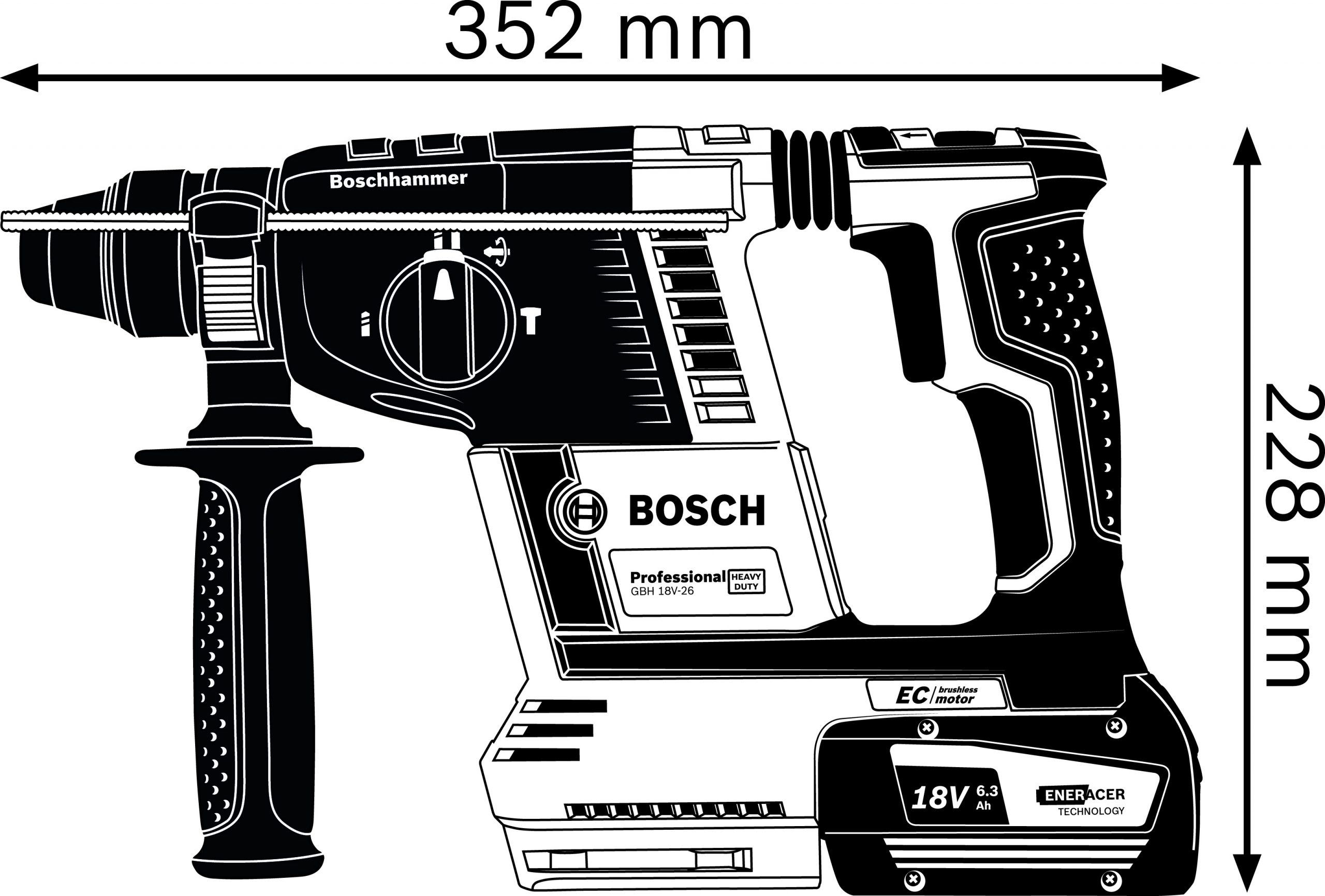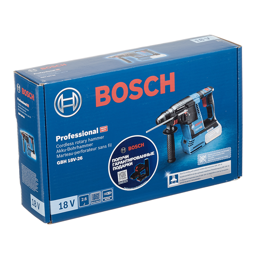 Аккумуляторный перфоратор с патроном SDS plusrnGBH 18V-26 Professional. rnНа 50 % больше мощности с энергией единичного удара как у инструмента с сетевым питанием для быстрой и гибкой работы (в сравнении с предыдущей моделью GBH 18 V-EC)rnПовышенная защита пользователя с помощью системы KickBack Control (KBC) и оптимальный контроль посредством системы Electronic Precision Control (EPC)rnСверление без пыли с инновационной встроенной и опциональной системой пылеудаления GDE 18V-16