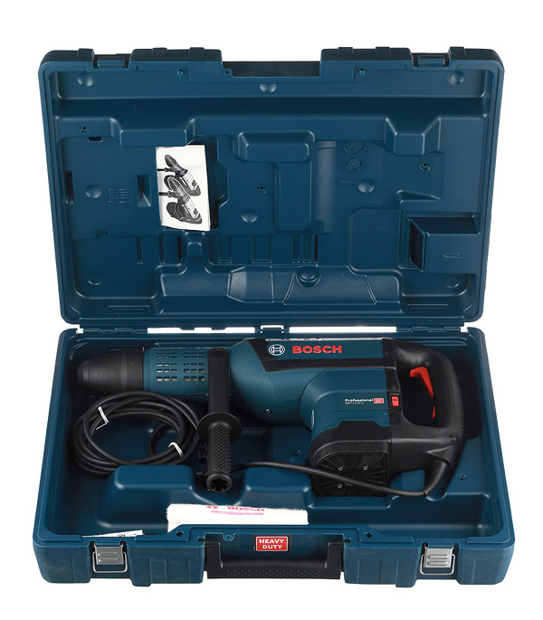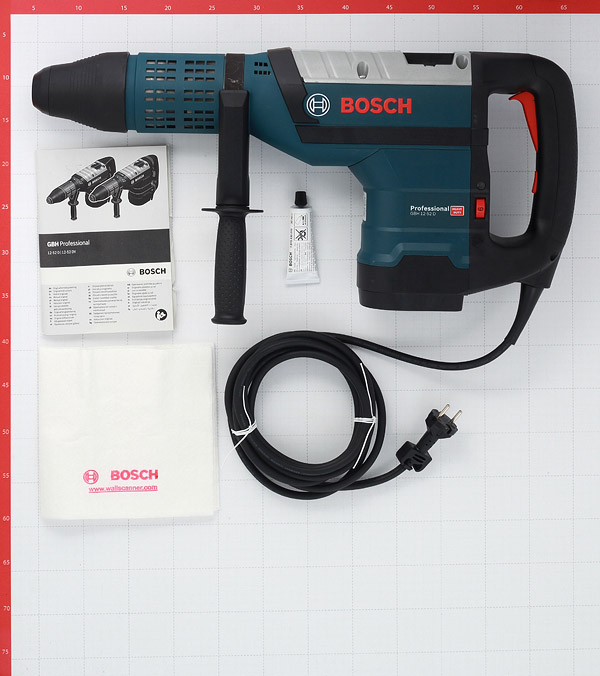 перфоратор, кейс, дополнительная рукоятка, салфетка, тюбик со смазкой.