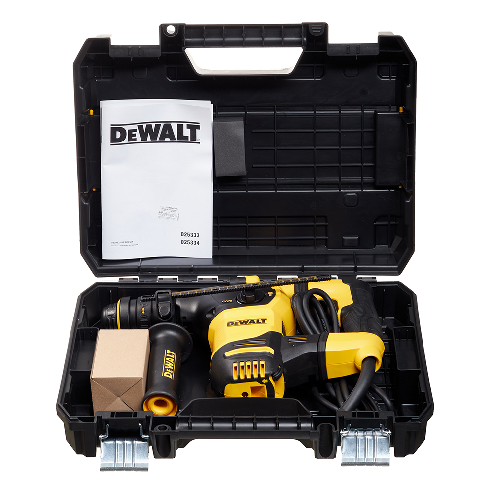 Перфоратор DeWALT D25334K оснащен 3 режимами работы плюс дополнительным быстрозажимным патроном. Патрон SDS-plus обеспечивает легкую смену оснастки. Имеется дополнительная рукоятка, которая равномерно распределяет вес инструмента и не позволяет уставать во время сверления. Кейс T-STAK помогает с легкостью транспортировать инструмент. Система защиты оператора Perform&Protect, активная антивибрационная система AVC, антивибрационная рукоятка.