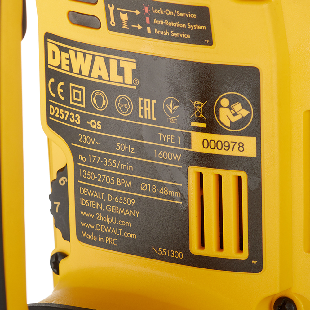 Перфоратор DeWALT D25733K оснащен 2 режимами работы. Патрон SDS-max . Антиротационная электронная система ADS, отключающая электропитание за доли секунды при заклинивания оснастки (система защиты оператора Perform&Protect), индикаторы износа щеток, активная антивибрационная система AVC.