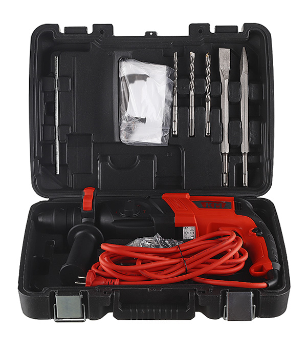 перфоратор, ограничитель глубины бурения, патрон SDS-plus, быстрозажимной патрон d13 мм, 3 бура: d8/10/12 х 150 мм, долото плоское 14х250 мм, долото пикообразное 14х250 мм, запасные щетки, кейс.
