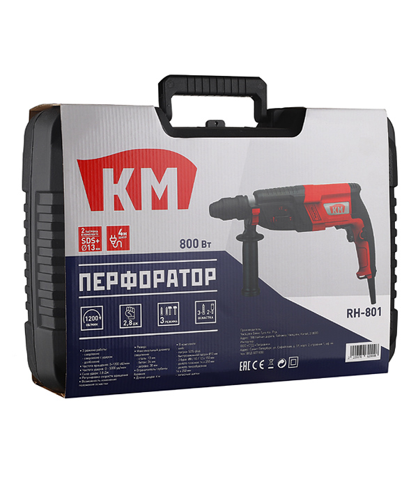 Перфоратор КМ 800 Вт предназначен для сверления, ударного бурения и долбления в таких материалах как бетон, дерево, металл.
