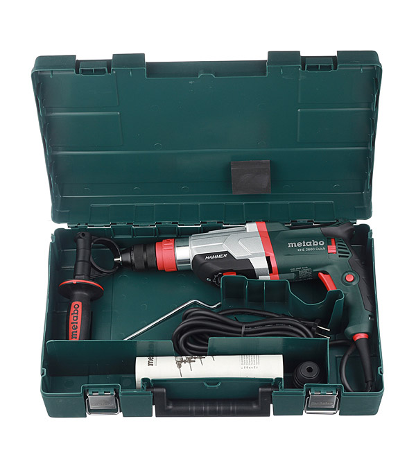 перфоратор, быстрозажимной сверлильный патрон для инструментов с цилиндрическим хвостовиком, прорезиненная дополнительная рукоятка, ограничитель глубины сверления, пластиковый кейс.