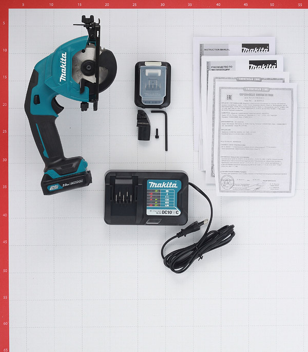 пила, пильный диск, 2 аккумулятора, зарядное устройство, кейс.