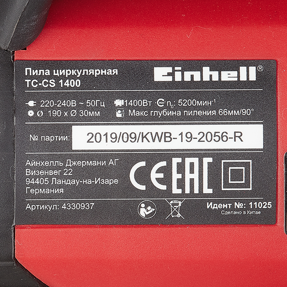 Пила дисковая электрическая Einhell TC-CS 1400 (4330937) 1400 Вт 190 мм