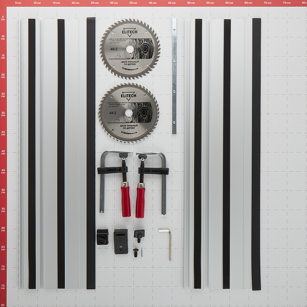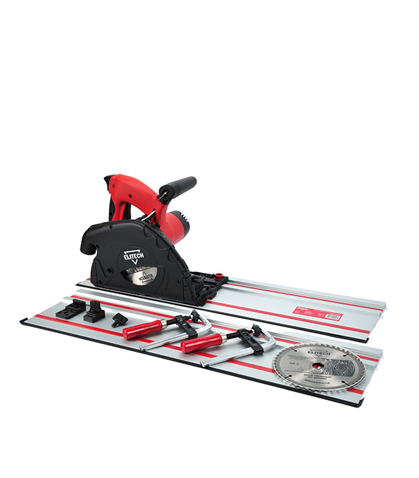 Пила погружная, пильный диск для чистового реза – 2 шт., направляющая шина 700 мм – 2 шт., соединитель направляющих шин, струбцина – 2 шт., стопор, антиопрокидыватель, ключ шестигранный.