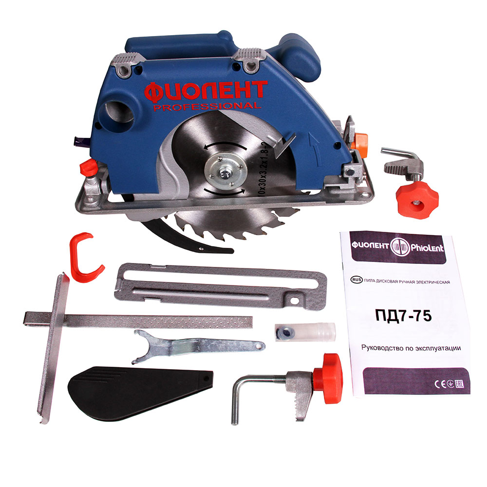 Дисковая пила ПД7-75 – 1 шт, линейка – 1 шт, ключ – 1 шт, торцовый ключ – 1 шт, комплект монтажных частей для стационарной установки – 1 шт, руководство по эксплуатации – 1 шт.
