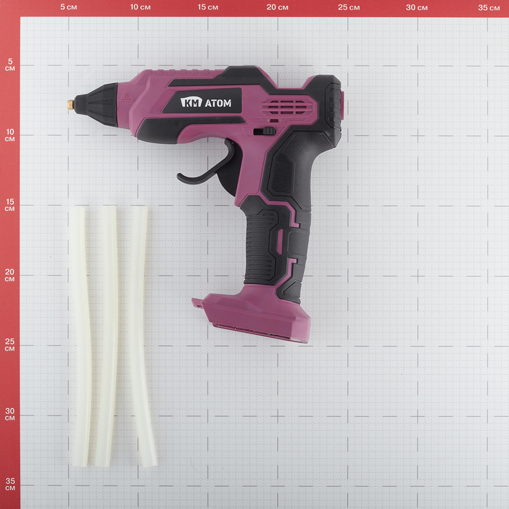 Этот инструмент входит в состав аккумуляторной платформы КМ АТОМ. rnВсе инструменты и садовая техника данной серии работают от универсальных аккумуляторов КМ АТОМ.rnТермоклеевой пистолет применяется для склеивания различных твердых материалов – натуральных или синтетических (дерево, пластмасса, картон, стекло, керамика, камень, ткани, пробка, кожа, металл). Используется для запайки строительных зазоров и щелей. rnВнимание! Зарядное устройство и аккумуляторная батарея в комплект не входят.