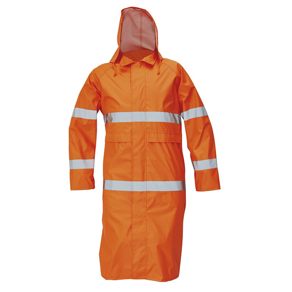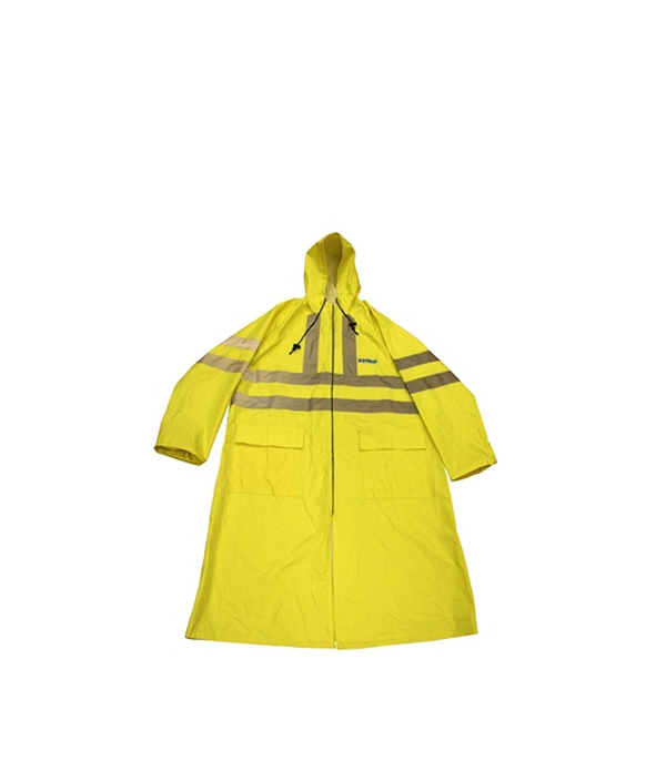 Плащ из нейлона, с ПВХ покрытием с внутренней стороны. Имеет светоотражающие полосы. Застегивается на молнию, в рукава вшиты манжеты, имеет капюшон и два кармана. rnПредназначен для защиты от атмосферных осадков, ветра и различных загрязнений при проведении строительных и других работ на улице в условиях пониженной видимости.