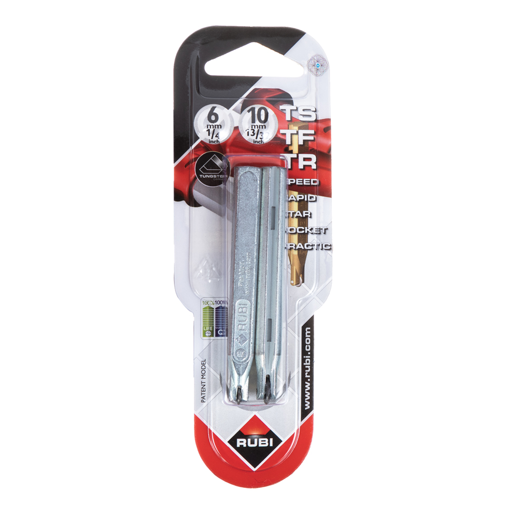 плиткорез, линейка с двумя шкалами (одна для определения ширины заготовки при резке под углом 90° (перпендикулярно), вторая шкала для определения высоты треугольника при резке под углом 45°), боковой упор, резец победитовый d6 мм роликовый Rubi (01945) – 1 шт., резец победитовый d10 мм роликовый Rubi (01946) – 1 шт., футляр.
