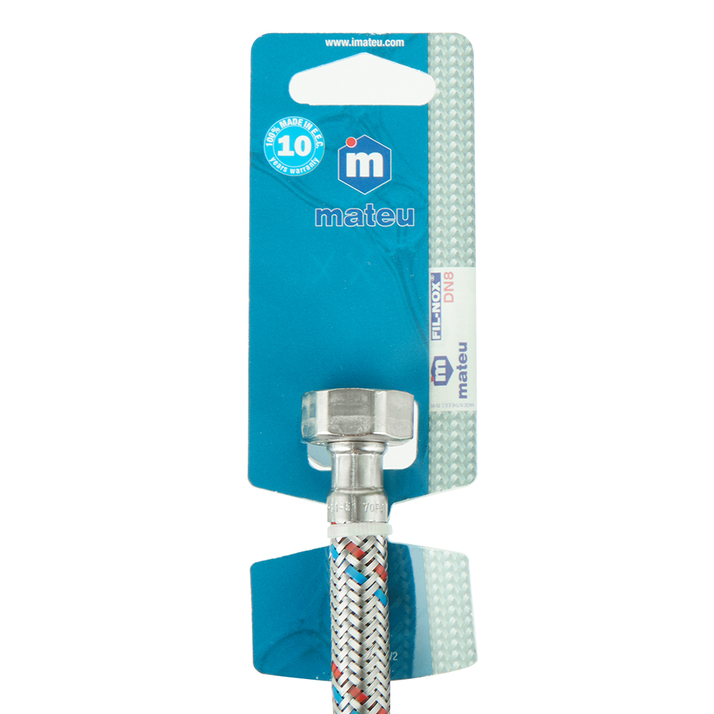 Резиновый шланг (EPDM) в оплетке из нержавеющей стали AISI 304, гайки, ниппель и штуцер – латунь.