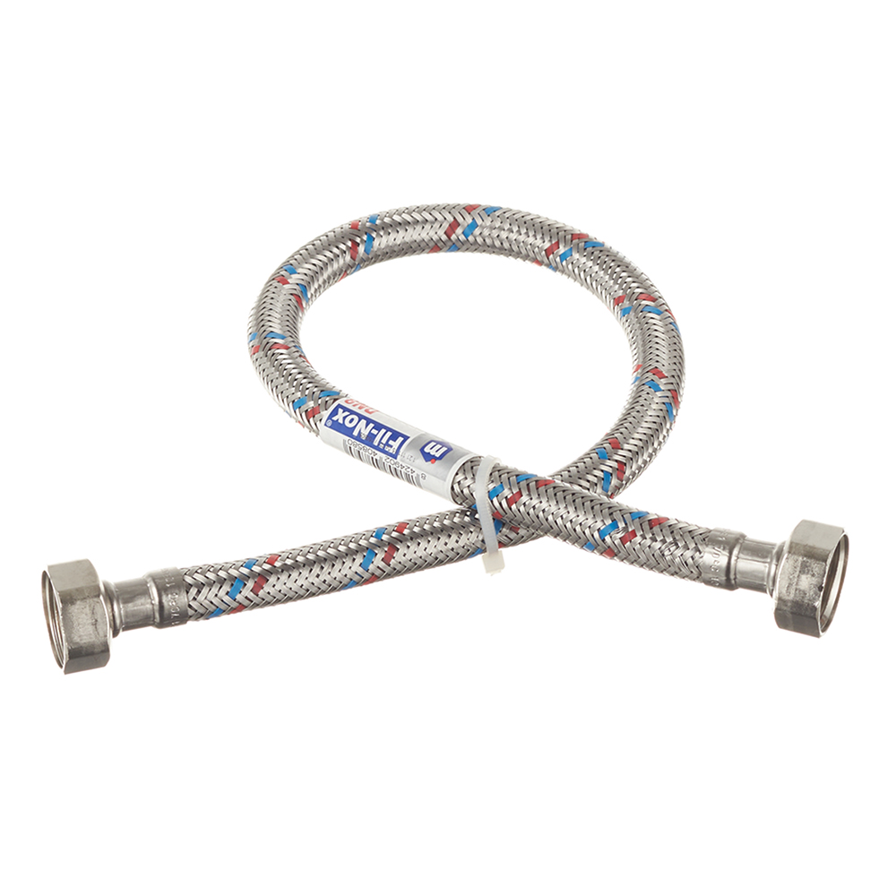 резиновый шланг (EPDM) в оплетке из нержавеющей стали AISI 304, гайки, ниппель и штуцер – латунь.