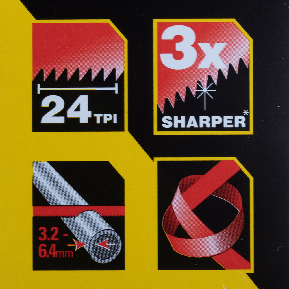 Предназначено для распиливания различных металлических изделий. Используется в качестве сменного элемента для ножовок по металлу. Одностороннее полотно имеет остро заточенные, закаленные зубья, что обеспечивает чистый и аккуратный рез. Имеет шаг зубьев в количестве 24 штуки на дюйм.