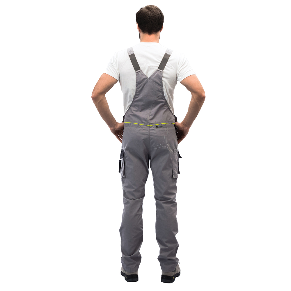 Полукомбинезон на бретелях, с застежкой брюк на молнию, дополнительным застегиванием на пуговицы по бокам. Большое количество накладных и прорезных карманов. Регулируемые эластичные бретели. Усилительные накладки в области колена в виде кармана для наколенника. Усиленная вставка в области промежности. Усиленные тройные швы. Повышенные прочностные свойства ткани благодаря технологии Рипстоп.