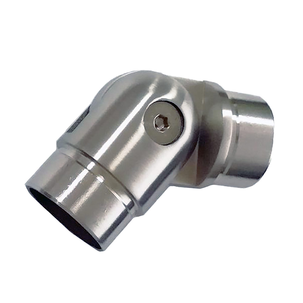 Шарнирное соединение двух частей поворотного элемента позволяет получить цельный поручень без разрывов по всей длине лестницы с несколькими пролетами. Поворот шарнирный для поручня может регулироваться и соединять разные части поручня при повороте или развороте лестничного марша на угол от 90 до 180 градусов.