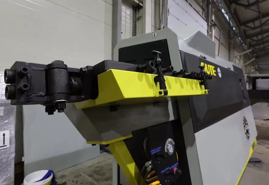 Правильно-гибочный станок с ЧПУ для работы с арматурной сталью. Обрабатывает арматуру диаметром до 12 мм. Максимальная скорость протяжки 75-100 м/мин. Мощность 31 кВт.