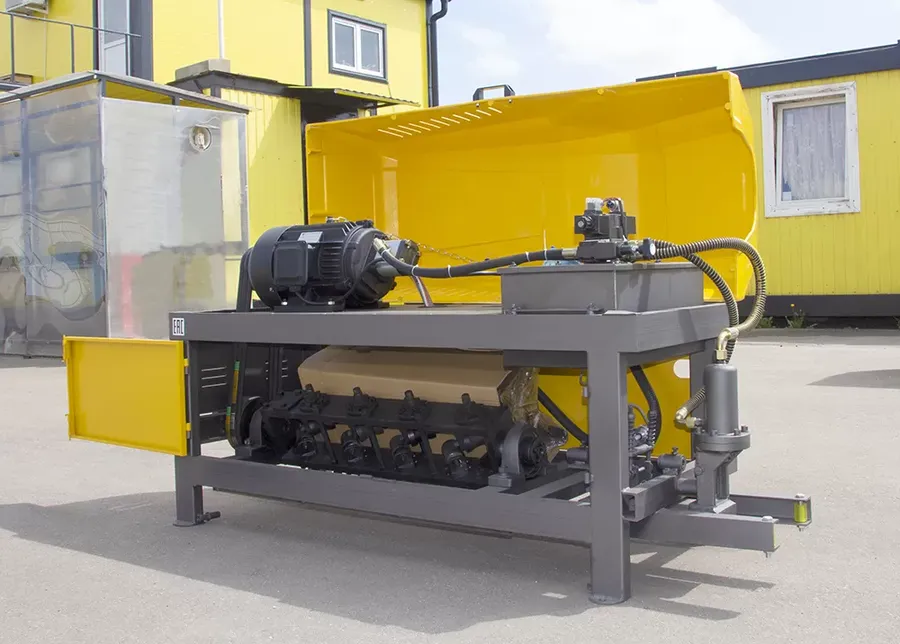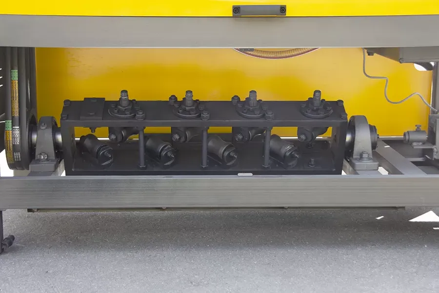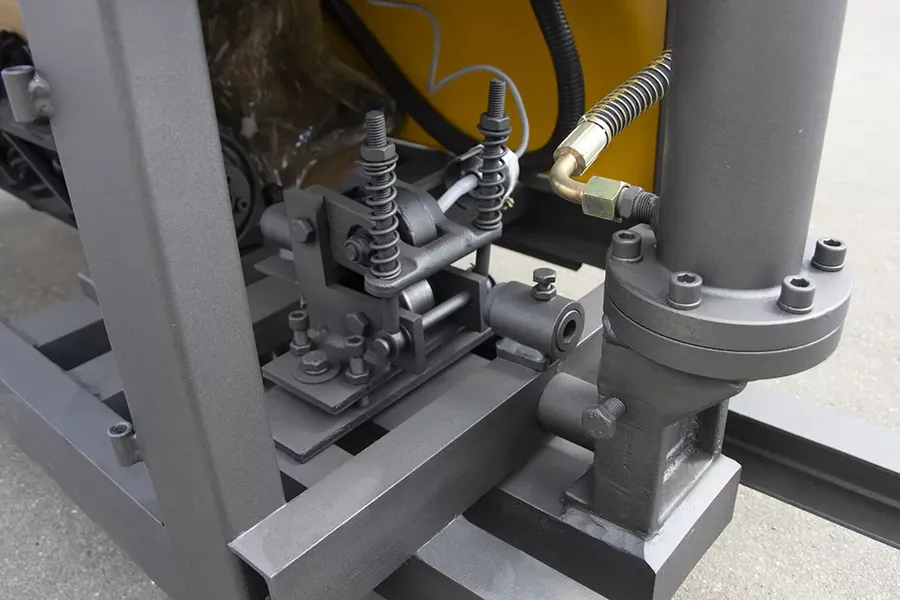 На станке VPK ПРО-14 Компакт электродвигатель через шкив и ремни передает вращение на выпрямляющую раму. Рама одновременно выполняет функции подачи и выпрямления арматуры. Выпрямление происходит за счет давления обкатных роликов на арматуру. Резку осуществляет нож при помощи гидропривода, давление в гидроприводе создается масляным насосом.